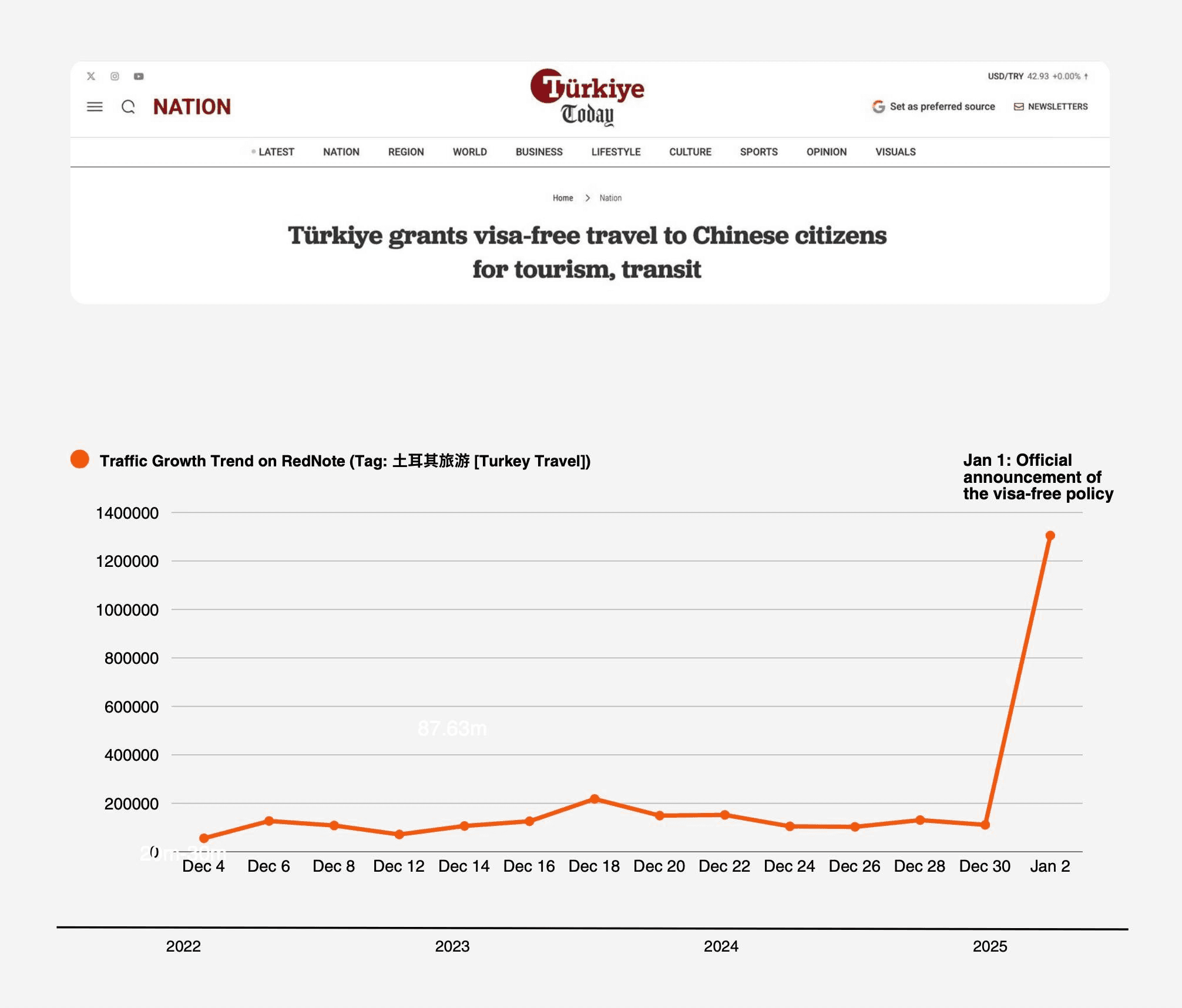 Within 24 hours, searches for "Turkey Travel" on RedNote (aka Xiaohongshu) jumped 500%. And early indicators show a 400% spike in Turkey-bound flight searches within hours of the announcement.